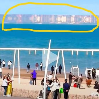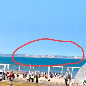 只见视频中,平稳的海面上,整个长长的虚影横贯天空,边际整都,绵延几十公里,若不是亲眼所见,还以为是电影殊效!