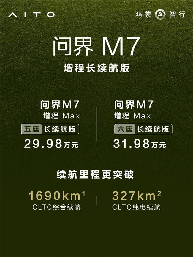 全新问界M7增程长续航版也于本日晓谕阐扬上市,并开启大定。新车推出两款设置:增程Max五座长续航版售价29.98万元,增程Max六座长续航版售价31.98万元。为回馈用户,即当前定可享受至高60000元的丰厚购车权利。