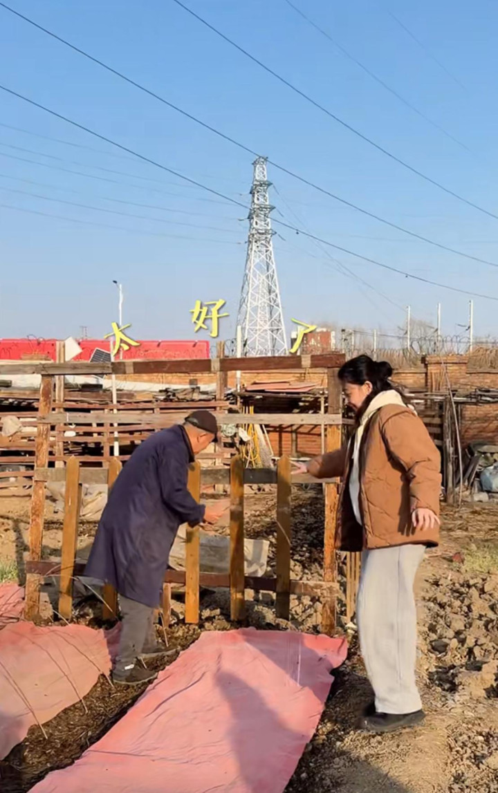 和公公沿途种小白菜的梅婷,种完菜的他们还给小白菜搭了一个塑料小棚子,服气用不了多久就能吃上了。