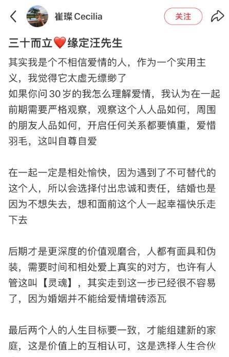 崔璨说我方以前不敬佩爱情,以为太虚了。但她其后发现和汪雨处对象很爽朗,是以决定成婚。成婚照里她穿得雅瞻念,腰细腿长,配上汪雨的像片看不大出年龄差。崔璨还晒了不少两东说念主一齐旅游的像片,看起来情谊可以。