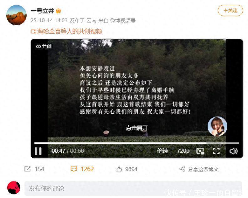 10月14日下昼,李亚鹏和海哈金喜已而在叮咛账号上官宣了仳离的音问。