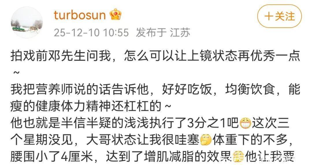 1月4日,女演员孙俪的助理共享视频并配文:“孙俪帮邓超腰身变小10cm的窍门就这?”视频中,孙俪说,邓超的腰身照旧瘦了10厘米,“确乎他此次(减肥)决心蛮大的,但愿他不要再胖回顾,因为他很容易反弹。”邓超是如何减肥的?谜底便是好适口饭!旧年12月,“孙俪教邓超减肥”的词条,一度冲上热搜。12月10日,孙俪在个东说念主支吾平台发文露出,邓超拍戏前问她,怎么不错让上镜景象再优秀少许。孙俪便把我方养分师说的话告诉他,“好适口饭,平衡饮食,能瘦的健康,膂力精神还杠杠的。”“他将信将疑的淡淡实行了3分之1吧,这三个星期没见,老迈景象让我很哇噻!”孙俪说,邓超体重下得未几,但腰身小了4厘米,达到了增肌减脂的后果,“他让我要好好表扬他,难说念不是他要好好谢谢我吗 ?”