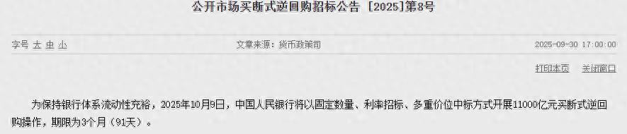 【大河财立方音讯】9月30日,中国东谈主民银行发布公告称,为保抓银行体系流动性充裕欧洲杯体育,2025年10月9日欧洲杯体育,将以固定数目、利率招标、多重价位中标模式开展11000亿元买断式逆回购操作,期限为3个月(91天)。