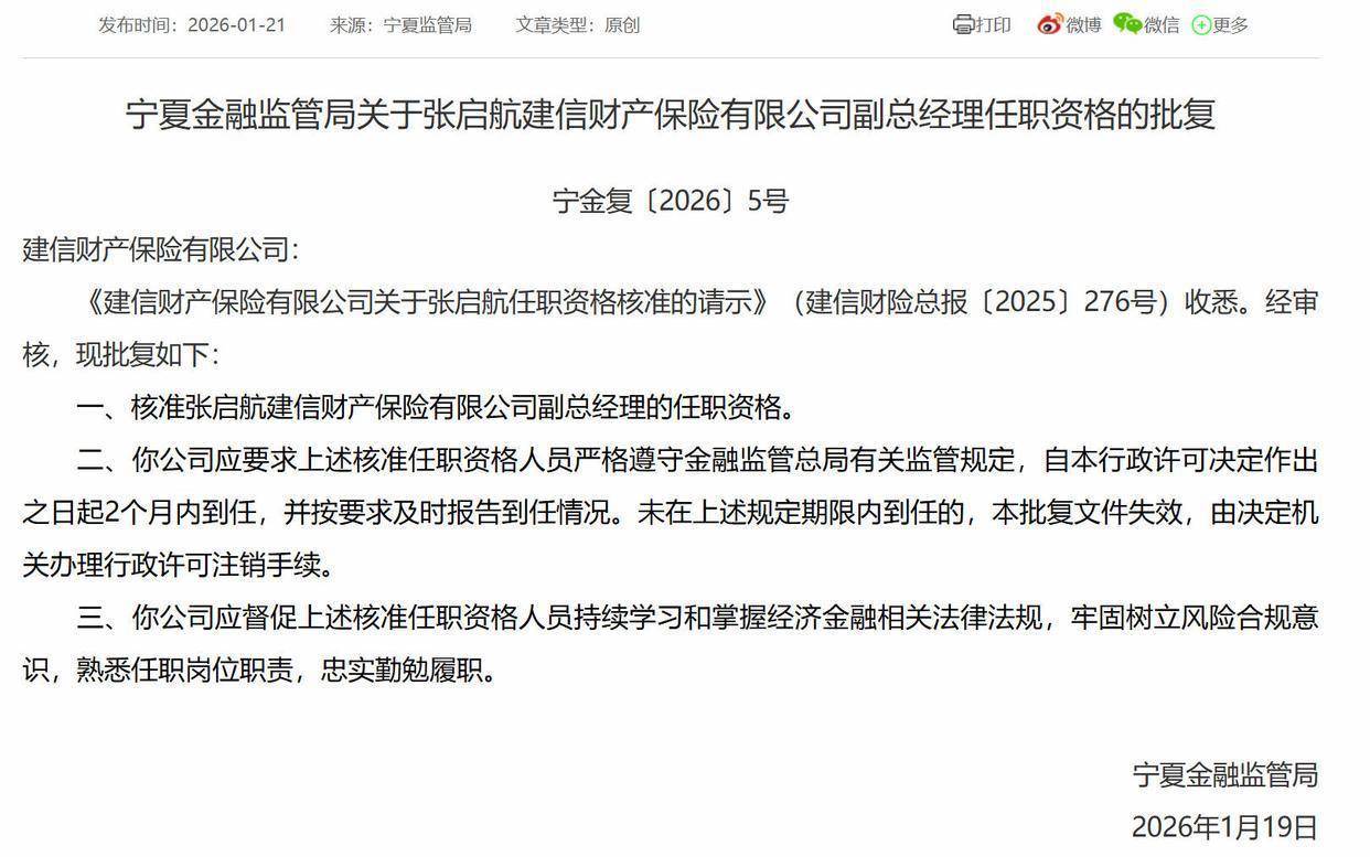 蓝鲸新闻1月21日讯(记者 陈晓娟)当天,宁夏金融监管局露出公告,核准张启航建信财产保障有限公司(下称“建信财险”)副总司理的任职阅历。建信财险缔造于2016年10月,为中国修复银行集团旗下险企,注册本钱10亿元。