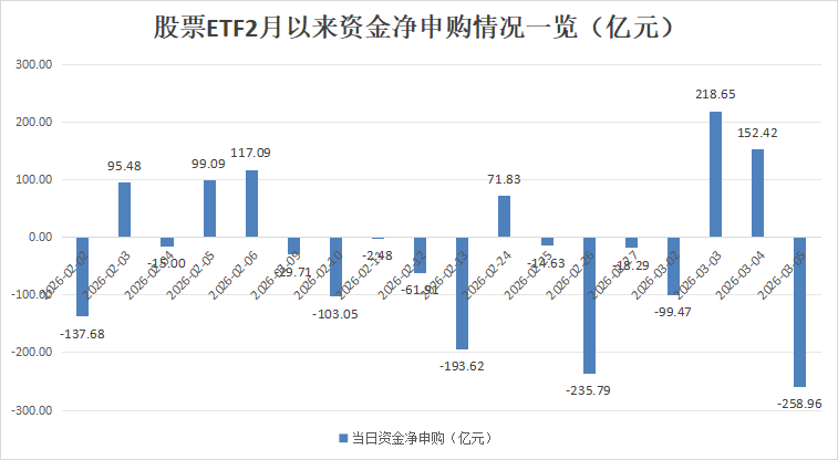 星河证券基金议论中心数据显现,杀青3月5日,全市集1347只股票ETF(含跨境ETF,下同)最新限制达到3.78万亿元,在昨日股市反弹行情中,股票ETF市集资金净流出金额达258.96亿元,这不仅是继2月26日之后,股票ETF市集再现200亿元级的资金净流出,亦然自本年2月以来,股票ETF市集单日最大净流出。